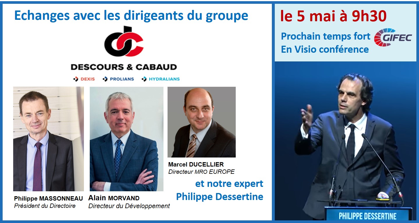Ce séminaire digital réunira l'expert économique et futurologue renommé Philippe Dessertine, les dirigeants de DESCOURS et CABAUD, et tous les adhérents du Gifec, le 5 mai à partir de 9 h30, sur invitation.